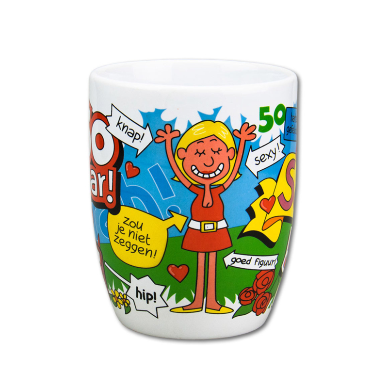 De volledige tekst op de cartoonmok luidt: 50 jaar \ knap \ zou je niet zeggen\ hip \ echt waar \ hartelijk gefeliciteerd \ goed figuur !