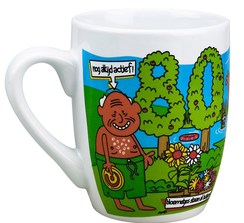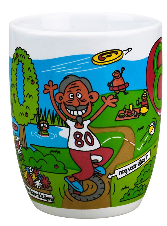Beker / Mok 80 jaar! Deze cartoonmok is voorzien van vrolijke kleuren, grappige afbeeldingen en leuke teksten. Leuk om te krijgen, leuk om te geven en leuk om te vullen met snoep.