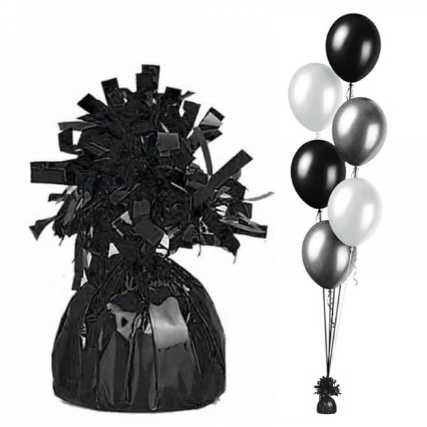 Ballongewicht in metallic zwart folie. Het gewichtje heeft een grootte van 6x15cm en weegt 180 gram en heeft een lusje om een tros ballonnen aan te bevestigen