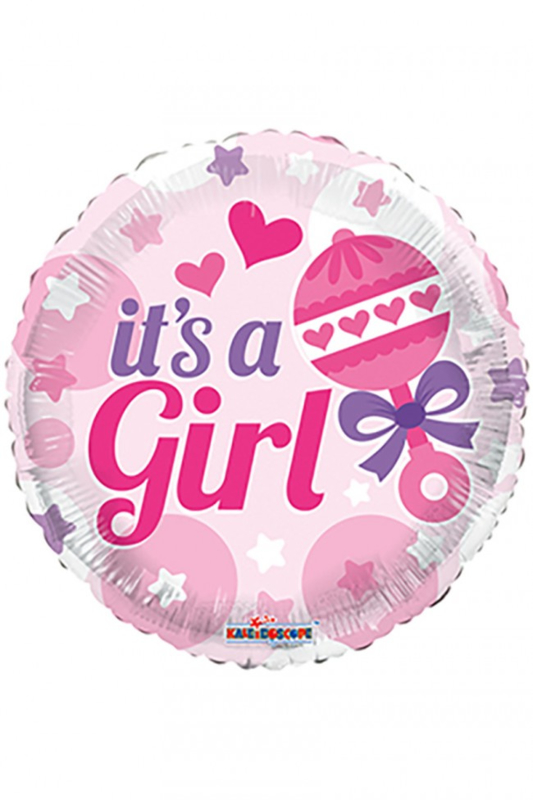 Folieballon baby It's a Girl. Deze folieballon heeft een grootte van18 inch (45cm) en kan zowel met lucht als met helium worden gevuld. Wanneer de ballon gevuld wordt met helium, blijft hij zweven.