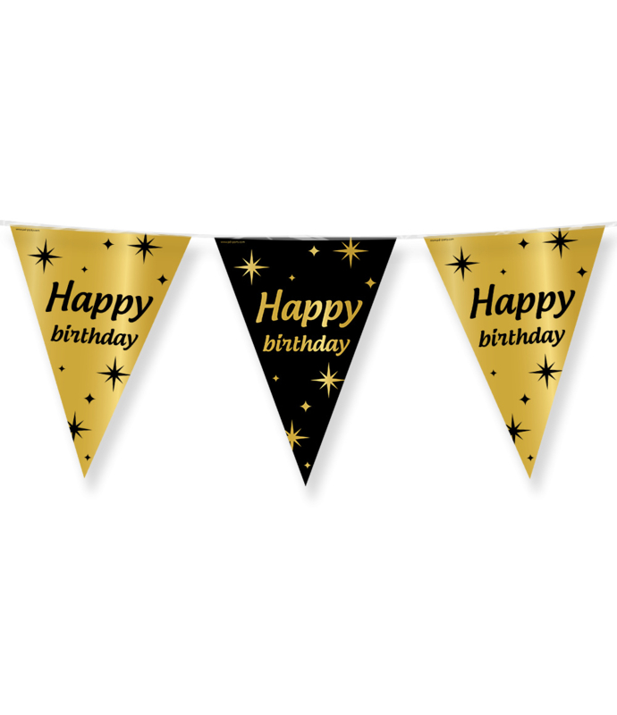 Door de kleur zwart goud vallen deze party vlaggen extra goed op! De aan beide kanten bedrukte vlaggetjes zijn gemaakt van folie, en hebben een lengte van 10 meter.